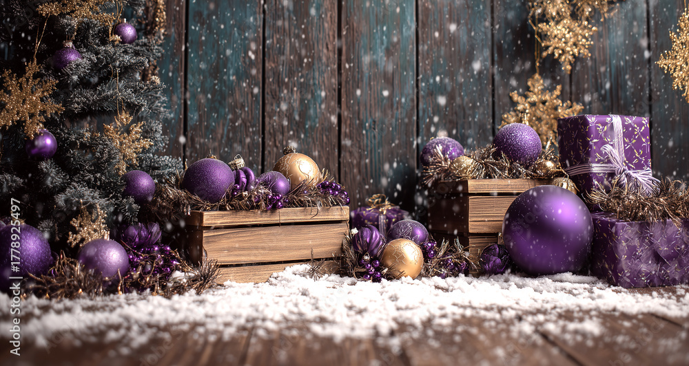 Adornos púrpura con detalles dorados colgando de árbol nevado, rodeados de regalos sobre superficie blanca.Navidad vibrante en púrpura y dorado, evocando elegancia, fantasía invernal y atmósfera. #1778925497