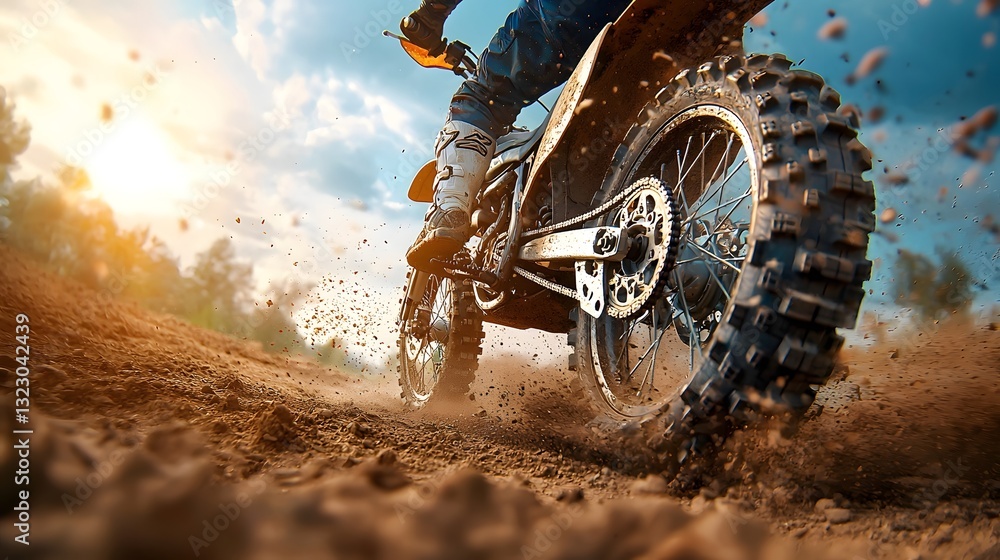 Adrenaline fueled Off road Dirt Bike Blasting Through the Desert Landscape at High Speed Captured from a Low Angle Rear Perspective with Visible Suspension and Dust Effects #1323042439
