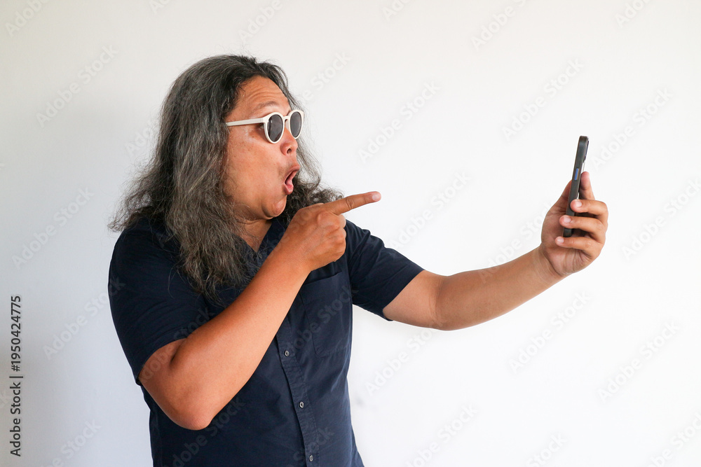 Adult asian man happy expression while making video call on smartphone #1950424775