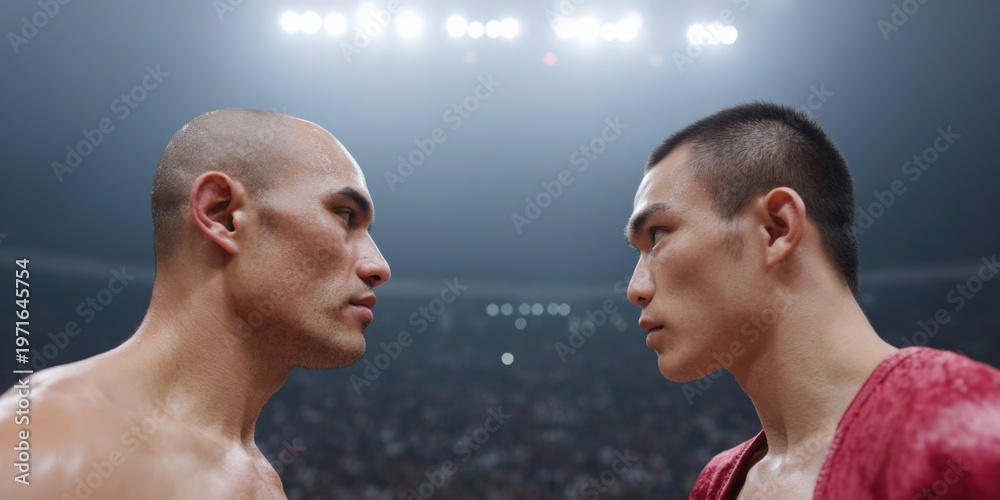 Adult male caucasian boxer and adult male asian boxer stare down in ring under bright arena lights before fight #1971645754