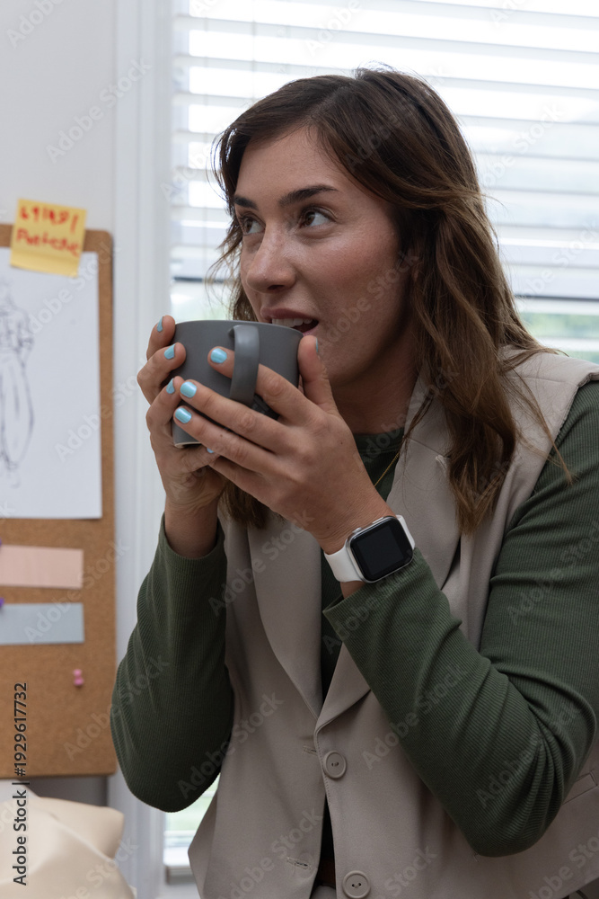 Adult woman holding gray mug, sipping and looking left in studio with corkboard, blinds, smartwatch #1929617732