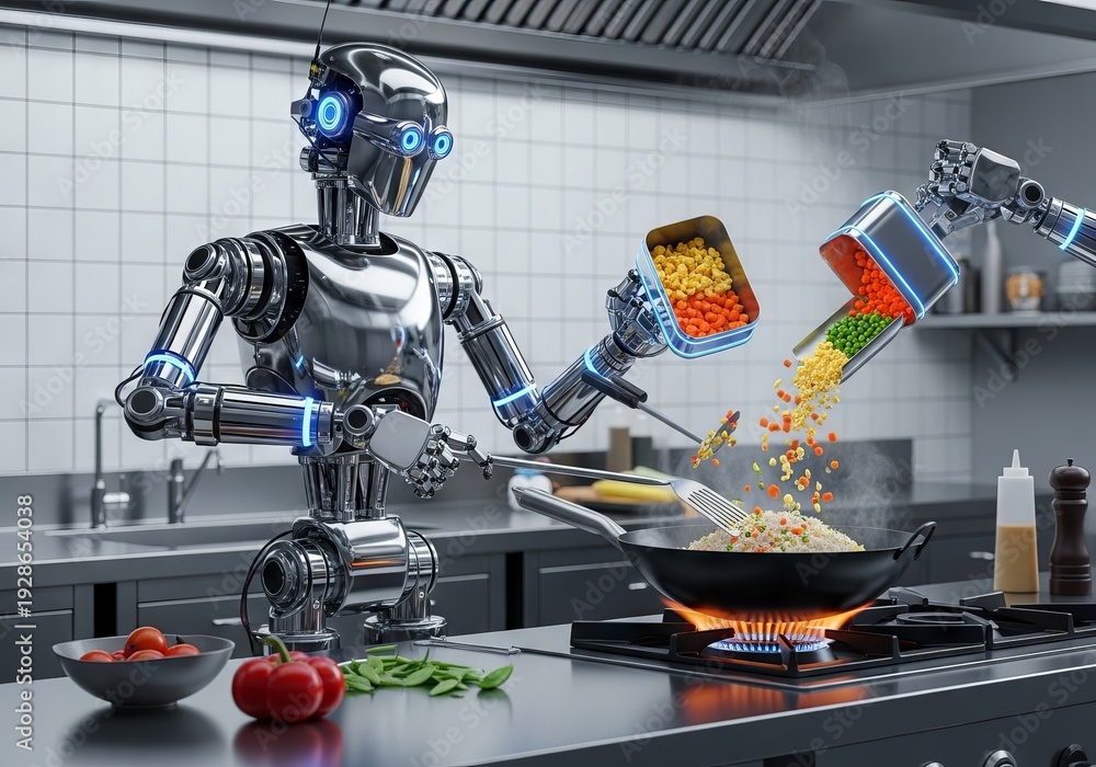 Advanced metallic robot skillfully cooks delicious fried rice in a modern professional kitchen, showcasing automation and culinary technology, prepare, artificial intelligence, precise #1928654038