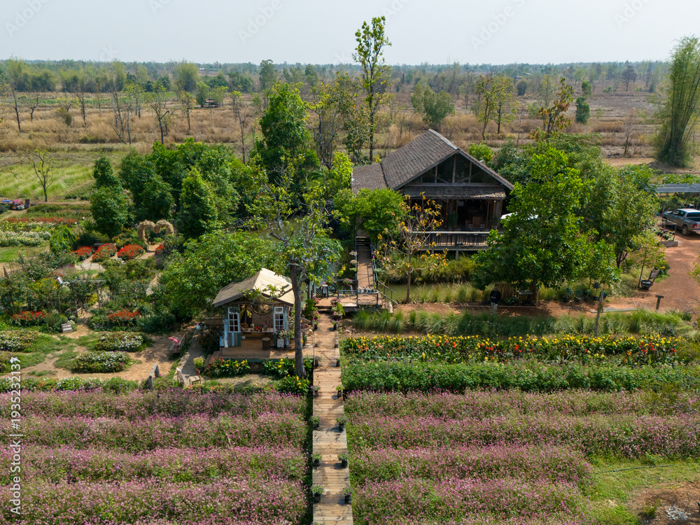 Aerial Drone View of Flower Garden with Wooden Bridge and Serene House #1935232137