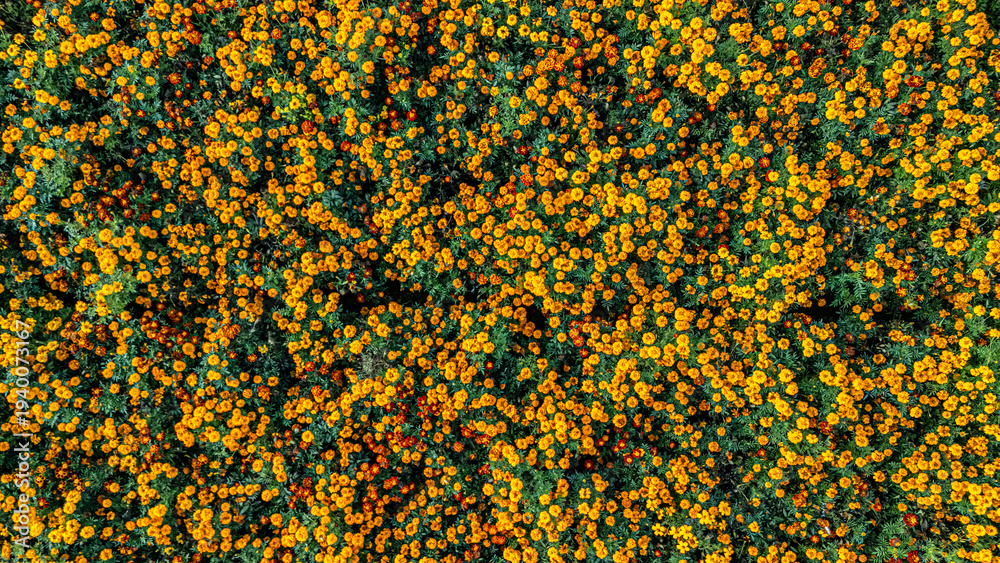 Aerial drone view of marigold flowers fields farm, orange marigolds flowers colorful background, typical Dutch agriculture landscape, the Netherlands #1940073167