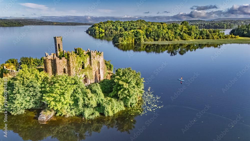 Aerial drone view of woman paddling SUP board on beautiful Lough Key lake with McDermotts Castle on small island, stand up paddling water adventure on vacation, travel in Ireland #1940074583