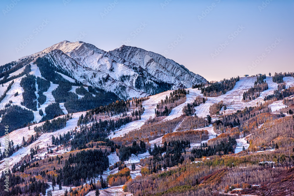 Aerial high angle view of ski resort town city of Aspen, Colorado after winter snow on Buttermilk mountain slopes with valley in autumn fall #542025046