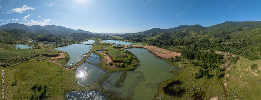 Aerial panoramic view of artificial fish ponds and wetlands surrounded by green hills and mountains in Santa Catarina, Brazil under a clear blue sky. #1954531933