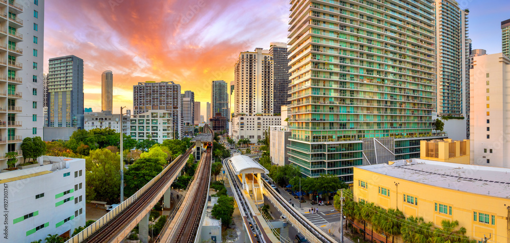 Aerial scene of Miami Brickell elevated railroad and passing commuter train between tall buildings and glowing sunset in Florida, USA #1927303767