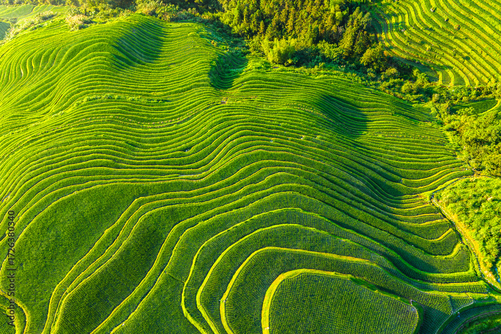 Aerial top down view of beautiful green rice terraces on the mountain illuminated by morning sunlight in Guilin, China. #1726380340