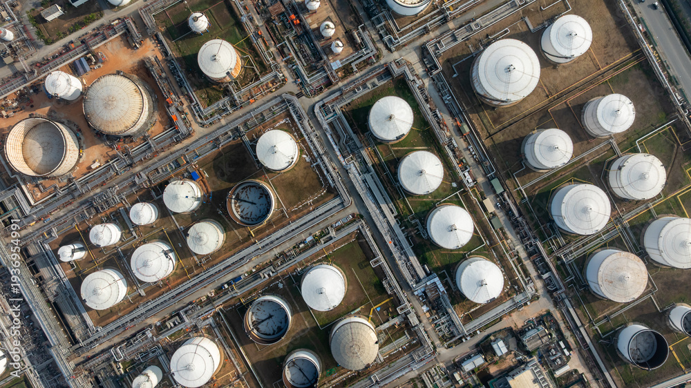 Aerial view industrial storage tank farm for oil and gas or chemical, Global fuel supply oil and gas, Industrial oil and gas storage tank farm facility energy reserves infrastructure fuel supply chain #1936954991
