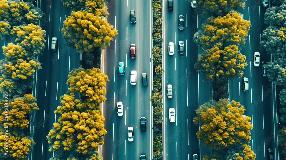 "Aerial view of a busy highway with numerous vehicles, dense traffic, urban planning, city grid, modern infrastructure #904088272