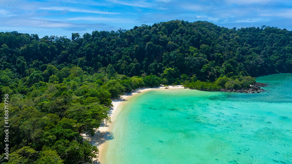 Aerial View of a Crystal Clear Beach with tropical Paradise Island #1888717758