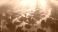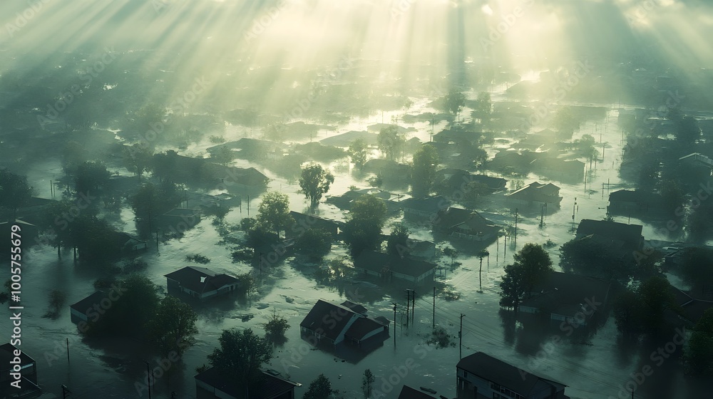 Aerial view of a flood ravaged suburban community with flooded streets and partially submerged houses highlighted by the sun s rays breaking through the cloudy dramatic sky #1005755679