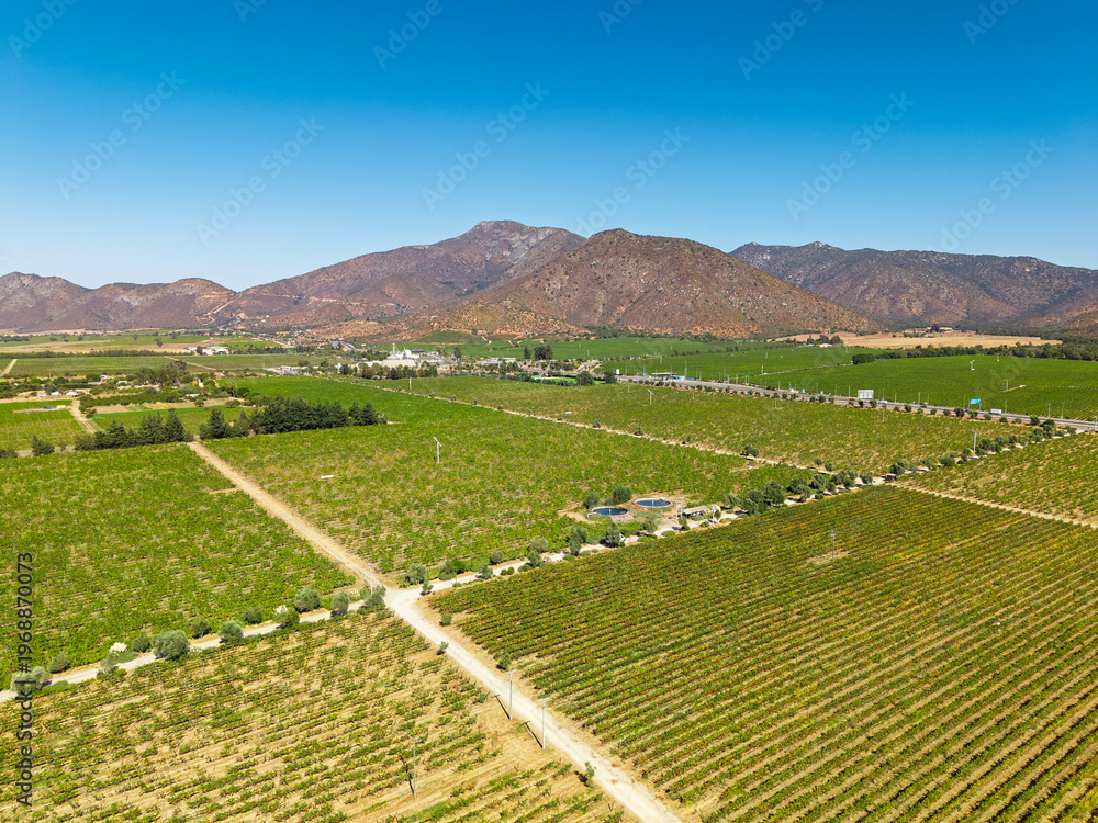 Aerial view of a large vineyard with lush green vines in a scenic mountain valley under a clear blue sky, rural agricultural landscape in summer #1968870073