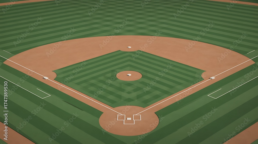 Aerial View of a Pristine Baseball Field Capturing the Diamond, Bases, and Meticulously Maintained Striped Outfield #1747389530