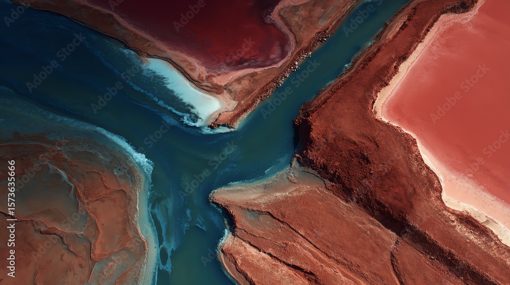 Aerial view of a river carving through red and brown rocky terrain, creating a striking contrast with blue water and earth-toned landforms. #1573635666