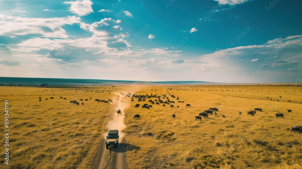 Aerial view of a safari jeep kicking up dust as it follows a massive wildebeest herd migrating across the vast savanna #891347191