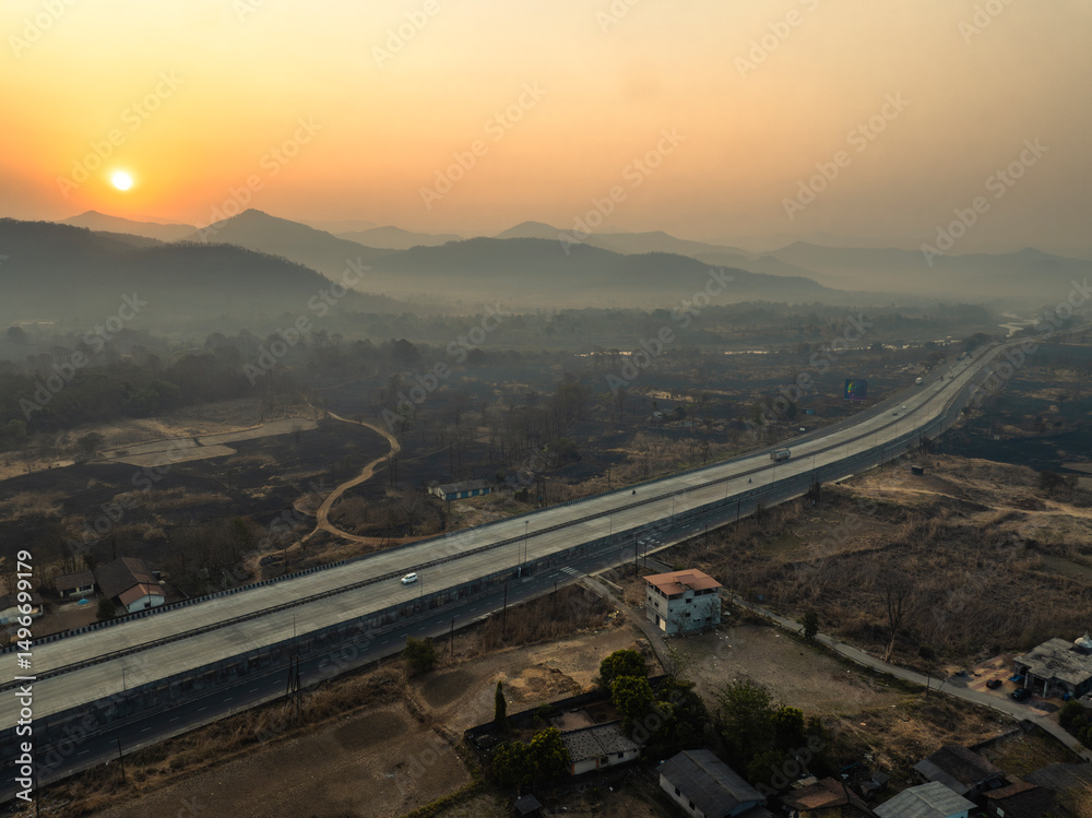 Aerial view of a scenic highway, part of the Mumbai-Goa Highway, stretching through rural fields and hills at sunset, with vehicles travelling along the road under a warm, orange sky. #1496699179