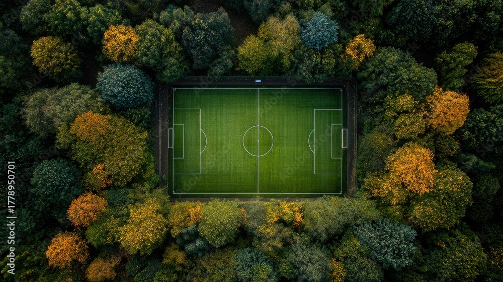 Aerial view of a soccer field surrounded by lush green and autumnal trees, creating a vibrant and natural scene #1778950701