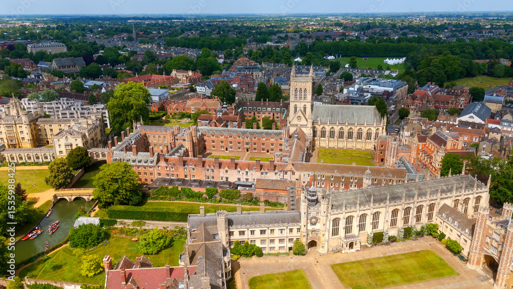 Aerial view of Cambridge University campus with surrounding city on a sunny summer day #1535988425