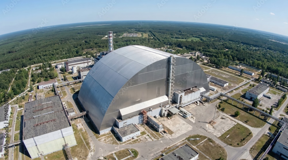 Aerial view of chernobyl new safe confinement protecting reactor, pripyat, ukraine with surrounding forest landscape on a clear day #1945181173