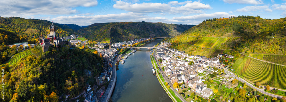 Aerial view of Cochem town with Reichsburg castle at the moselle river in Germany. Europe #1772705947