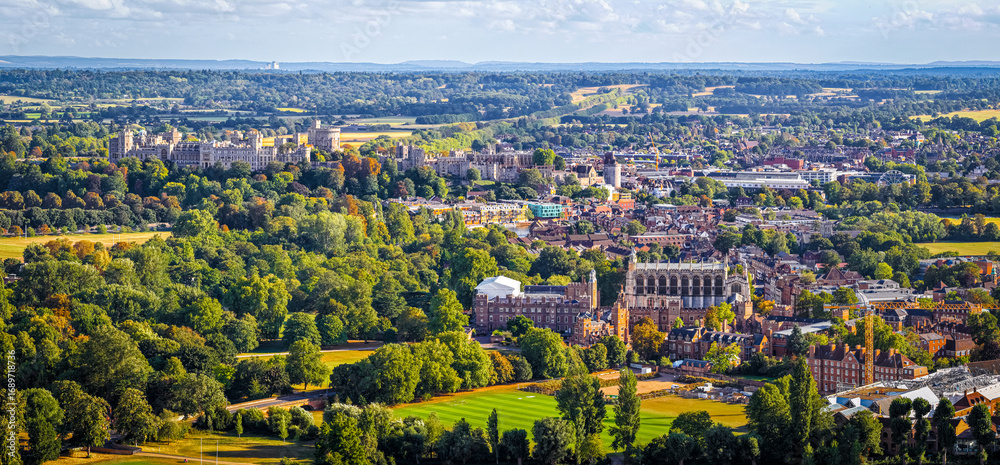 Aerial view of Eton College and surrounding historic town buildings with green fields #1689718736