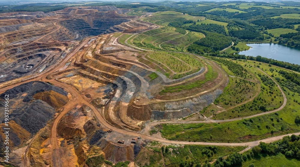 Aerial View of Mining Landscape Transitioning to Reclaimed Green Land #1937319662