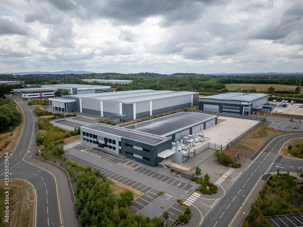 Aerial View of Modern Industrial Business Park in the UK Featuring Multiple Warehouses with Solar Panels, Landscaped Roads, Secure Fencing, and Empty Parking Spaces under a Cloudy Sky #1595395984