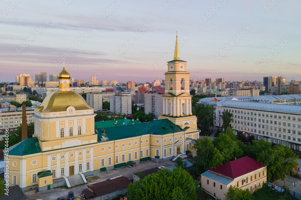 Aerial view of Perm and historical building, Kama river with bridge in sunny summer day with green trees in the sunset #437446056