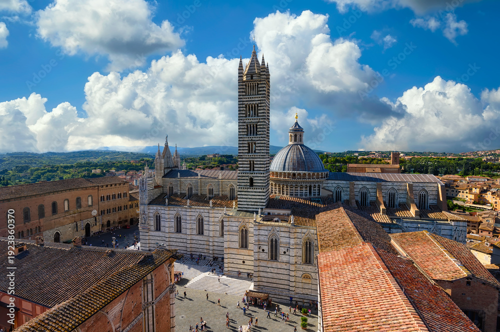 Aerial view of Siena Cathedral Santa Maria Assunta (Duomo di Siena) and Piazza del Duomo in Siena, Italy. Skyline of Siena. #1923860370