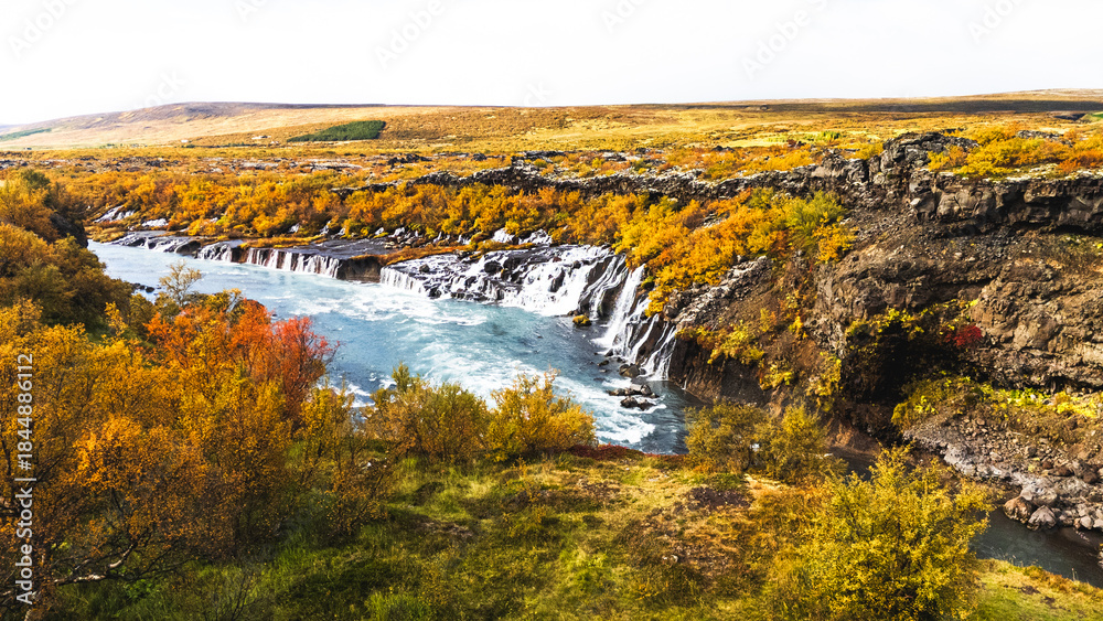 Aerial view of stunning Hraunfossar waterfalls in Iceland during summer. Turquoise glacial water cascades over ancient lava fields creating a unique natural wonder #1844886112