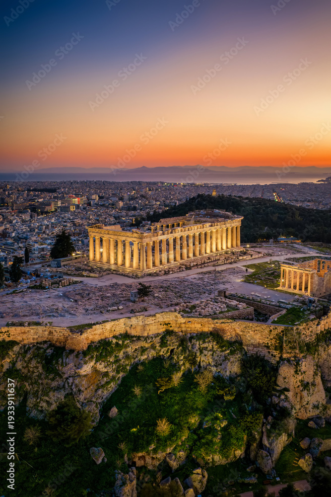 Aerial view of the illuminated Parthenon Temple at the Acropolis of Athens, Greece, during dusk with the city skyline behind #1933911637