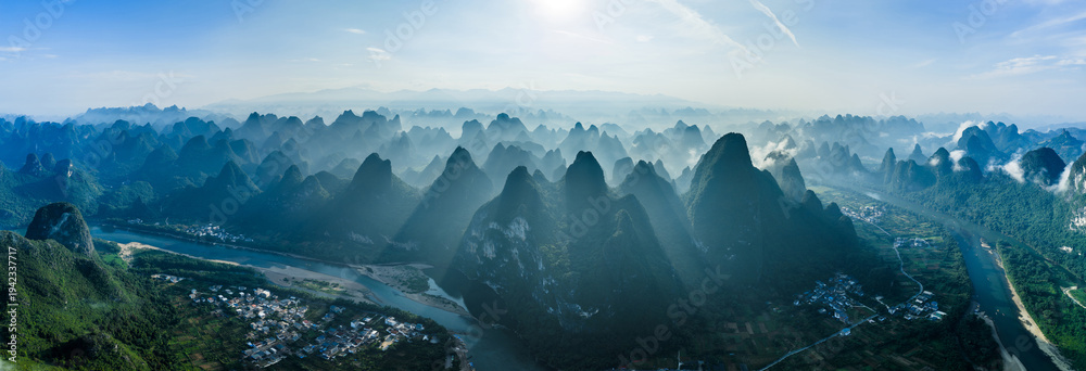 • #1942337717 Aerial view of the Li River and iconic karst mountains shrouded in morning mist in Yangshuo, Guilin, China.