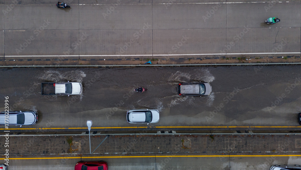 Aerial view of vehicles driving through flooded urban road after heavy rain, highlighting transportation challenges, climate impact, and city infrastructure issues. #1770223996