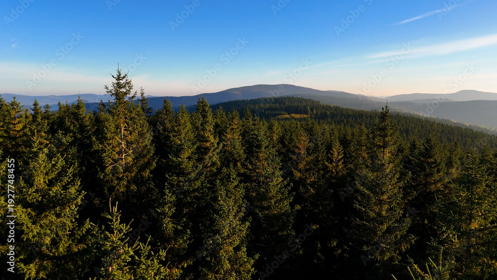 Aerial view of yellow aspen and green pine forests in early autumn in Colorado, USA. A picturesque autumn mountain landscape. #1927748455