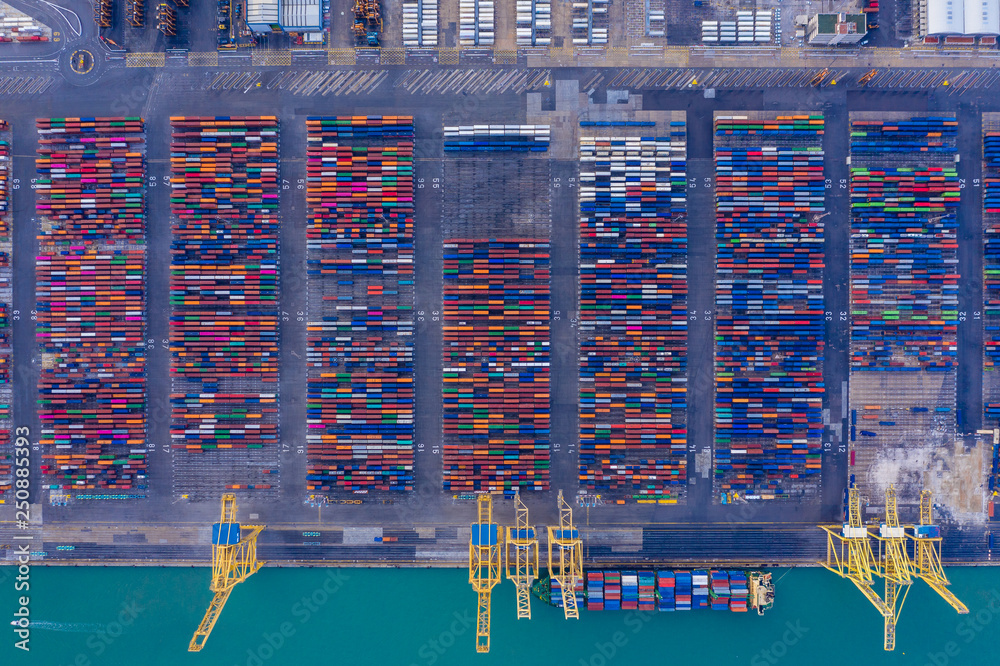 Aerial view to a lot of intermodal shipping container are in a port. cargo transportation system on ships. Graphic view of multi-colored containers on top. #250885393