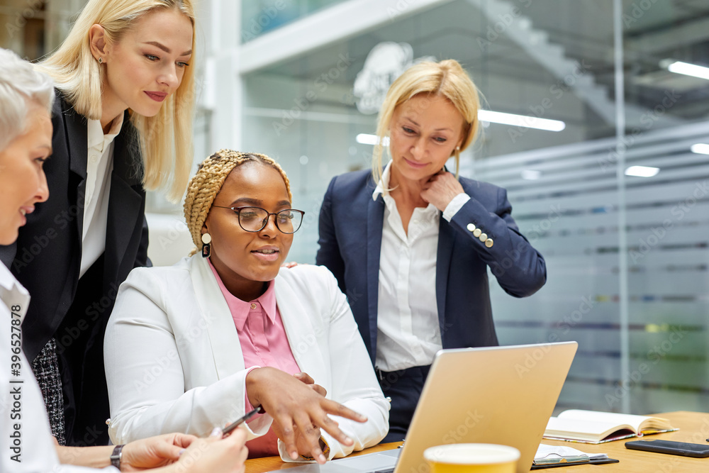 african female manager give directions to caucasian partners, business colleagues, they have talk in light modern office. brainstorm #396527878