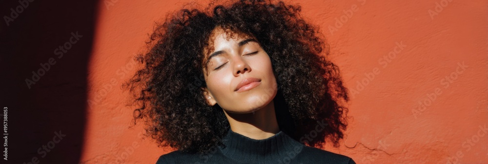 African female young portrait eyes closed basking in sun against textured red wall curly hair peaceful expression #1957388053
