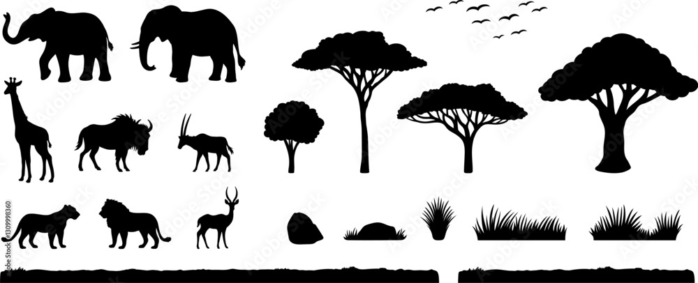 African Safari Scene Creator Builder Clipart Set - Animal and Grassy Landscape Silhouette Elements on a Transparent Background #1309998360