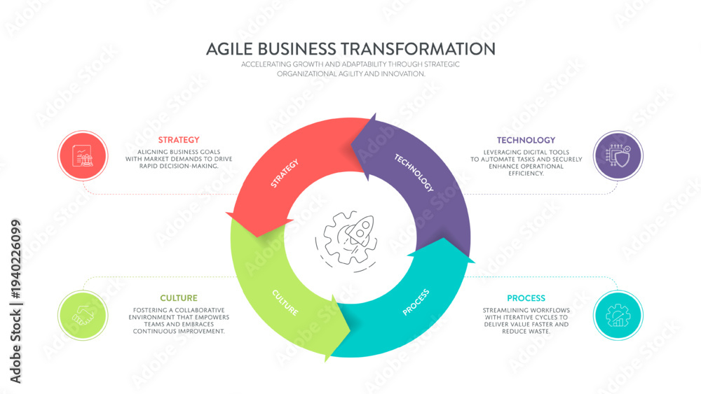 Agile Business Transformation Infographic Vector. Strategy, culture, process, key technology elements. Effective corporate framework for marketers, executives and key speakers Presentation Slide. #1940226099