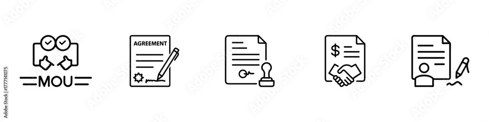 Agreement, MOU, and legal document outline icon set – contract, signature, approval, business deal, and official paperwork symbols #1777141075