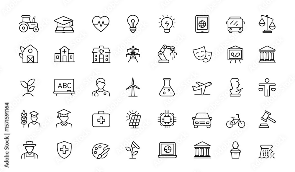 Agriculture, education, healthcare, energy, technology, transportation, arts, justice sector line editable icon set, social infrastructure vector illustration, transparent background. #1571591164