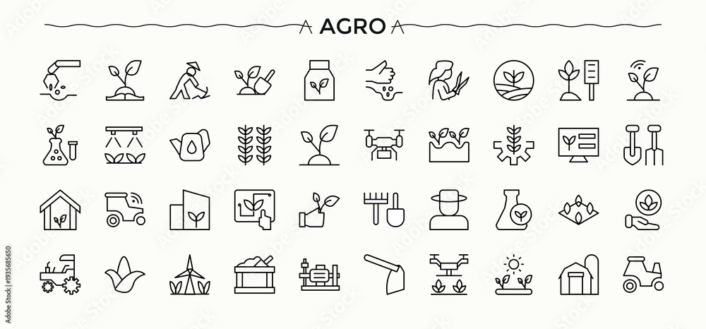 • #1935685650 Agro icon set. Agriculture line icon set. Trendy minimal icons. Included harvest, farm, agriculture, plant and more. Editable stroke. Vector illustration.