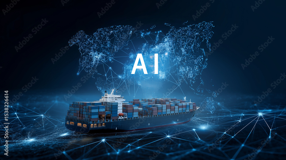 AI and global logistics concept with world map, supply chain network, and container ship for import-export #1538226614