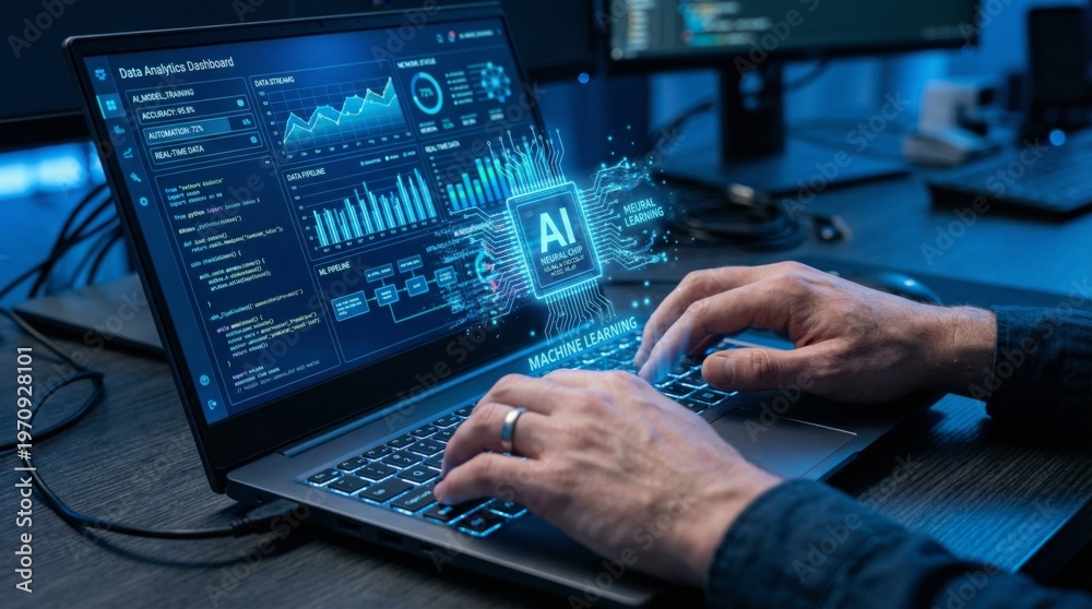 AI automation and data flow on laptop screen with machine learning dashboard and hands typing on keyboard for advanced artificial intelligence software development and business analytics #1970928101