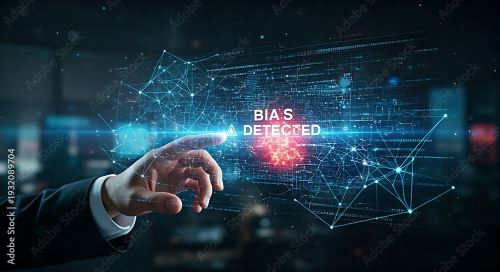 AI bias detection concept. An AI scans a holographic dataset and highlights a cluster of points in red, with a "BIAS DETECTED" alert. #1932089704