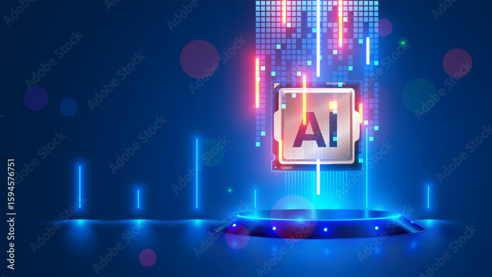 AI chip hover above the podium in cyberspace. Processor with AI letters for artificial intelligence on a presentation stand surrounded by electronic clusters of signals in the beams of searchlights. #1594576751