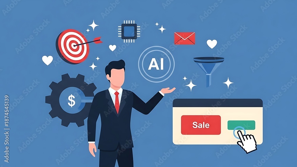 AI Driven Marketing and Sales Optimization Concept with Business Professional, Target, Funnel, and Digital Interface Illustration #1874545139