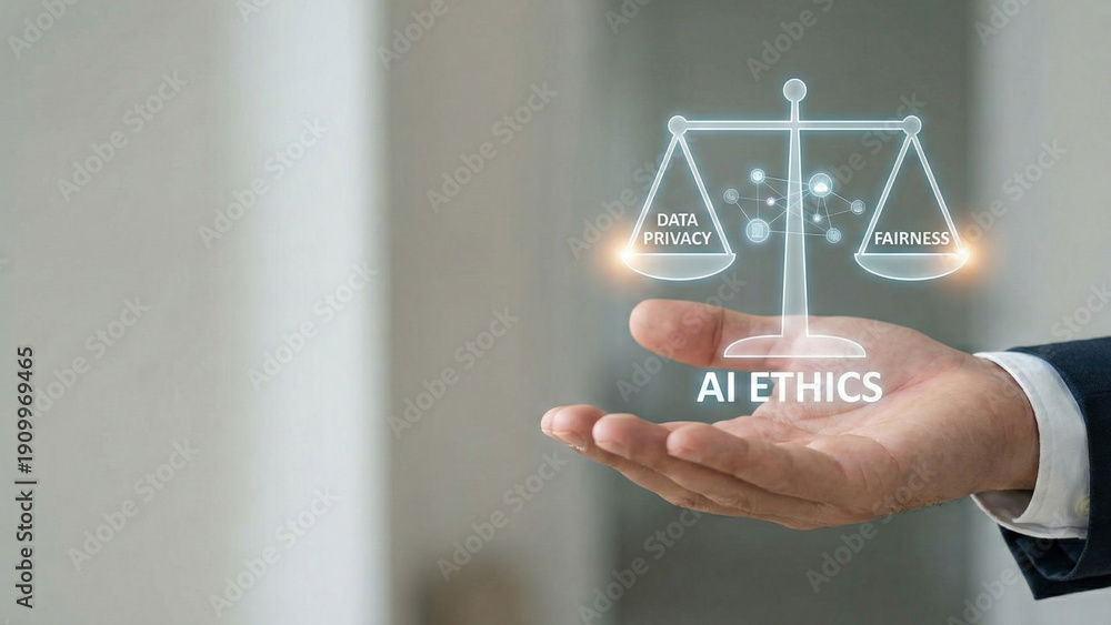 AI ethics concept with scale highlighting data privacy fairness and responsible machine learning visual design business hand offering balanced #1909969465